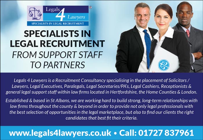 Legals 4 Lawyers is an established Recruitment Consultancy based in St Albans, Hertfordshire specialising in the placement of Solicitors, Lawyers, Legal Executives, Paralegals, Legal Secretaries / PA’s, and general Legal Support Staff within law firms throughout Hertfordshire, the Home Counties and North London. We provide a professional and pro-active service working hard to find you the right position based on your experience, qualifications, specific requirements and salary expectations. However our job does not finish there – we will keep in touch and work with you to achieve your planned career progression and your future goals.